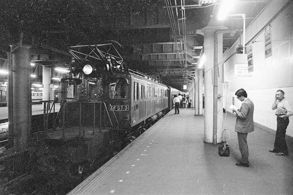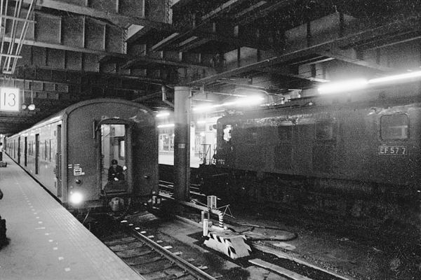 新幹線なんぞ影も形も無い国鉄時代、上野駅の地平ホームが、夜の帳に包まれると 北に向かう夜行列車のゴールデンタイムとなります。2名の鉄な方が、レンズを向けて いるのは、18キップなんざぁ足元にも及ばないコスパだった、均一周遊券で北海道を 全国を鉄旅してた、ジ〜サン鉄の愛用列車19:10発101列車急行「八甲田」青森行で ございます。編成先頭の牽引機は、今も唯一静態保存されている、「宇」EF57 7号機。