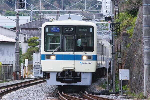 早川沿いに箱根湯本に向う箱根登山線の中間駅、風祭駅傍の踏切りからスナップを アップです。しても、駅名の風祭てぇなぁ、誠に響きの宜しい駅名じゃございませんか、 大都会にある、商魂が見え隠れしている、野暮な駅名たぁ月とスッポンでございます。 オープニングは、その風祭を発車した、6両編成数本が、サテナス車両として西武の 所属車になるてんで、チョイっと話題になった、箱根湯本〜小田原間箱根登山線内 運用らしい8000系4両編成を小田原方面にある、服部第三踏切から撮った画像です。