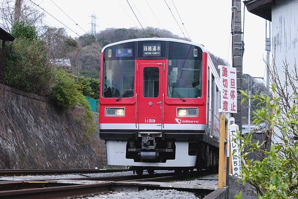 そして、箱根の山の緑にスイス生まれの赤が映えた、レーテッシュカラーの1000系を 服部第三踏切から移動、ホーム際の風祭水車踏切ってな、これまた風流な名称の 4種踏切からスナップです。この風祭水車踏切をググると、結構ヒットするんですよね。