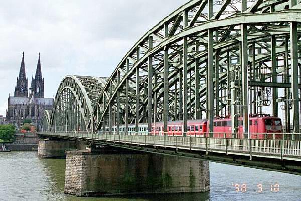 大聖堂をバックに、ライン河に架かるホーエンツォレルン橋梁上を行くDBの110型。