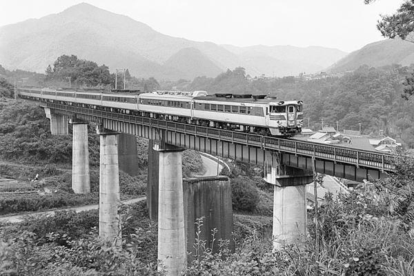 今回のヘッドマーク探検団は、始発京都なれど終着は、ミステリートレイン並に複雑な 山陰本線の特急キハ82系「あさしお」でございます。何故ミステリートレイン並みかと 申しますと、1日4往復運転の「あさしお」、終着駅の方は、米子、倉吉、城崎の3ヶ所と 言うスジ設定でした。止めは、2往復ある城崎〜京都のスジも11Dと12Dは、舞鶴線、 宮津線経由ってな鉄分過多なスジ、モチロン宮福線は、未だ未開通でございました。 撮影年月日とは、一年のズレがあるけど、手元に在る一番近似値の時刻表1975年 8月号の編成表ページを見ると特急「あさしお」は、下り方面先頭から順に1号車から 9号車の9両編成、2号車はグリーン車となっています。しかし、アップしたキハ82系の 2両目にキロ80が、組み込まれています。そして、特急「あさしお」が渡っているのは、 下山駅から上り方面に約0.5kmほど、レンガ積みの旧橋脚が、有名な高屋川橋梁で ございます。ところが、画面奥が下り側なのに1号車が、編成の先頭になっています。 なので、アップの特急「あさしお」は、城崎発宮津線・舞鶴線経由12D京都行と推測で ございます。 山陰本線 下山〜胡麻 1976-10 Photo by 富山の迷鉄 |