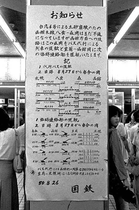 台風の為不通になった函館本線の代行バスと函館〜室蘭代行連絡船の案内板