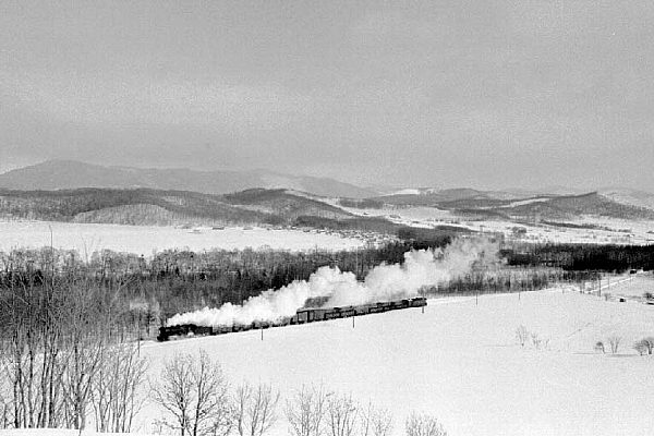 96牽引貨物列車の向うには凍結した白い佐呂間湖、北海道らしい雄大な景色。
