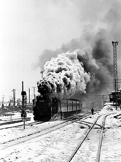 猛然と煙を上げて出発する、D51牽引の普通列車。