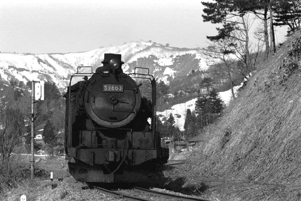残雪の朝日連峰を背に、宇津峠を下る96牽引の貨物列車。