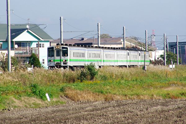 珍しい都市風景の非電化複線高架区間を狙ったけれど、架線柱が建ち架線も装架済で、 札沼線 新琴似