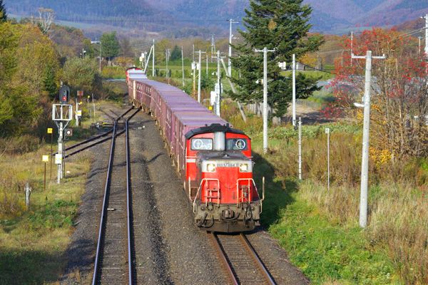 野も山も錦に染まる北の大地北海道にDD51の牽引列車を撮りに、