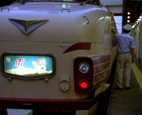 | さて、本来ならここで本日の予定終了となるはずだったのですが、この日の大阪からの雷鳥31 号がボンネットの運用であることが判明。しつこく福井駅で撮影することにしました。 雷鳥31号の福井到着は18時9分。露出もかなり落ちているうえに、左側は駅の高架工事中。 |