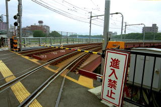 | 足羽川にかかる幸橋は、鉄道線が分離されていました。以前は道路と同じ併用橋だと思った のですが、なにせ古い記憶なもので・・・ ここでちょっと変わったものを発見。一見踏切のようで、よーく見ると遮断機が線路側に付いて います。どうやら鉄道橋を分離して、車や人が間違って入らないための措置のようです。 電車がくると、ご覧のように電車が通る側だけが開きます。 |