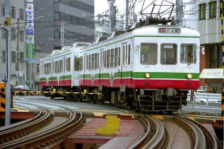 | 一夜明ければ、今にも泣き出しそうな空模様。この日は福井駅周辺の併用軌道で撮影開始で す。やってきたのは80形の広告塗装車。路面を一般規格の電車が走る姿は威風堂々、威圧 感があります。しかし、車を運転していてこんなのが走ってきたら、やっぱり怖いでしょうね。 |