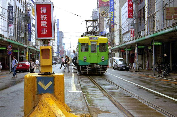 | 田原町でえちぜん鉄道から、福井鉄道に乗り換えました。初めは福井駅前からとも思って いたのですが、えちぜん鉄道から見た田原町の雰囲気があまりにも良かったので、急遽 田原町乗換えに変更です。田原町は木造上屋のいかにもローカル私鉄の駅という佇まい でした。ほどなくやってきた電車は200形。1960年製の元急行専用車です。 |