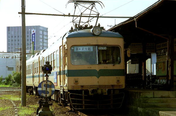 | そういえば、30年以上も昔、この急行専用車に乗りにきて、乗ったはいいけど前の席の浴 衣姿の美少女に目を奪われて、車窓の景色を全然見ていなかったなー なんて思い出しな がら、やがて電車は西武生へ。西武生には車庫があるので、なにか居ないかとウォッチング |