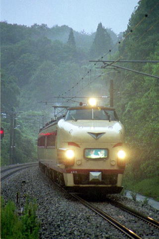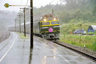 | 福井鉄道の撮影を終えて、北陸鉄道めざして金沢へ移動です。とうとう本格的に雨が降りだしま した。移動の途中、ボンネット「雷鳥」を撮るため牛ノ谷駅で途中下車です。牛ノ谷はローカルな 無人駅。ホームの真ん中あたりにポツンと小さな待合室があります。雨はいよいよ本降り。「雷鳥」 まではまだ時間があります。突然、駅の列車接近警報がなりました。「なにか来ますねー」「外に 出ると濡れるから待合室から撮りますか」なんてのんびり会話していたら、なっなんとトワイライト がやって来た〜 今日は9月6日土曜日、運転予定日ではないはずなのに、なぜだ!! |