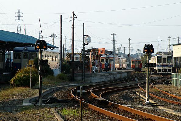 アイドル音を響かせて交換待ちキハ22、場内踏んでキハ20、昭和が漂う駅構内。
