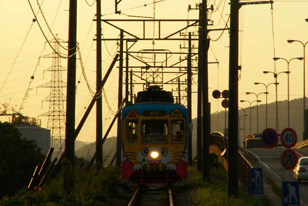 日暮れ時、新湊線をオーバークロスで跨ぎ能町口へ向かう万葉鉄道デ7070形ねこ電車。 万葉線 米島口〜能町口