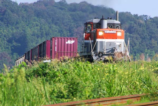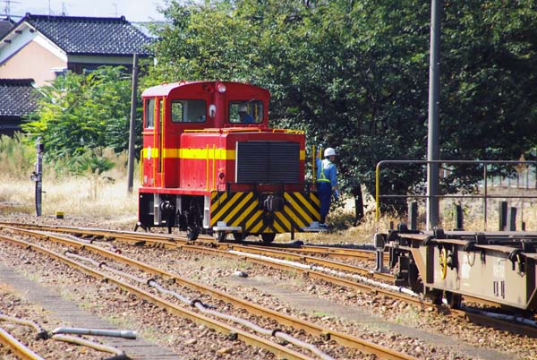 二塚に到着したコキを受けて、草生す専用線を工場へ向かう中越パルプのスイッチャーは 中越パルプ二塚専用線
