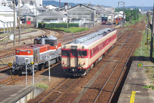 ヤードに隣接した専用線、機留線で待機しているDE10、その横を走り抜ける原色のキハ58. 高山本線 速星