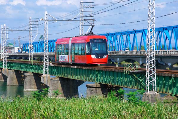 1935年川崎造船製の万葉線庄川橋梁を渡る、2009年新潟トランシス製の低床車アイトラム 万葉線 六渡寺〜庄川口 |
