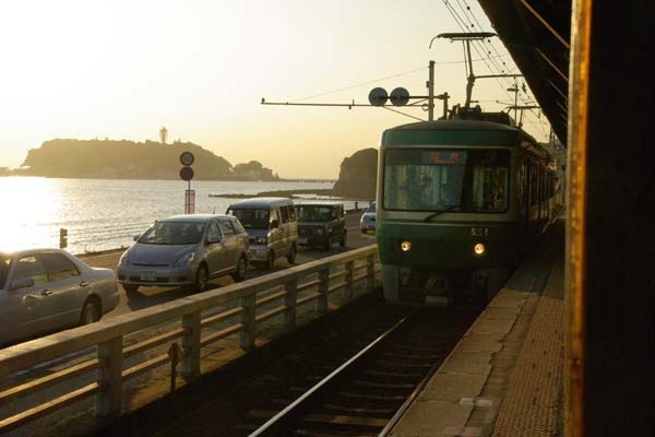 夕陽に染まる江ノ島を背景にした、江ノ電「鎌倉高校前駅」。1960年代には車社会の 波に飲まれかけた江ノ電も、今や湘南ブランドを背景に強力なメディアコンテンツと なり、平日でもデジカメ片手のオネーサンや昔はオネーサンやら、全国から湘南を 目指した定期外のお客さんで、4両編成の列車も結構な混雑でございます。そんな 人気沸騰な江ノ電の中でも、「鎌倉高校前駅」は目の前は七里ガ浜が広がる絶好の ローケーション、映像メディアにも度々取り上げられいるんですね。実はこの写真も 駅に張ってあったポスターを見て、その気になって撮りに行った時のヤツなんですが、 見てのとおり逆光も逆光バリ逆で、コンナ滅茶苦茶な写真が精一杯でございました。 後から冷静になって考えりゃポスターは絵だったもんなぁ〜、写真じゃ無理じゃんね。 江ノ電