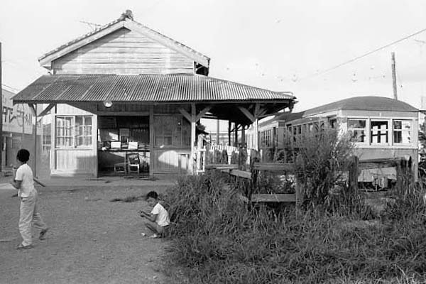 目立ちます。モノクロは1972年、カラーは2007年撮影ですから35年も経っているのに 変化がないですね。車両に目をやると、モノクロに単車写っているのが見えますよね。 2000系デハ1000の予備車なのですが、どうやらお上からイチャモンがついたようで、 もうすぐ引退らしい。でも駅舎にイチャモンはつかないらしく、もしかしたら35年後も 銚子電鉄