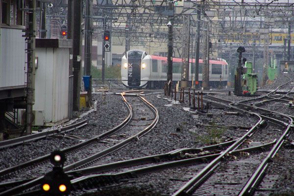 基本的には鉄な写真を撮る時はウットウシイ天候なんでございます。写真は撮りたし 濡れたくは無し、ナァ〜ンテ時は駅撮りに限ります。近づいてくる列車のヘッドライトが 反射して雨に濡れるレールがギラリ、バラストも枕木もシッポリ雨露のベールが包む、 こんなカットが苦労要らず、傘要らずで楽チンに撮れちゃうですから、って自画自賛 しようと思ったら、JR-EASTご自慢の最新鋭259系NEXの編成には架線柱がグッサト 4本も刺さっちまってた。でも、非電化区間じゃなけりゃ駅は架線柱のジャングルが 当たり前。ソレニ邪魔者の架線柱も昔ながらの鉄製ラーメン架線柱は次々と無粋な パイプやコンクリートの架線柱に代えられていくご時世でございます。たとえ串刺しに なろうが、あるがままに撮るのが駅撮りの肝かもしれませんね。 山手線