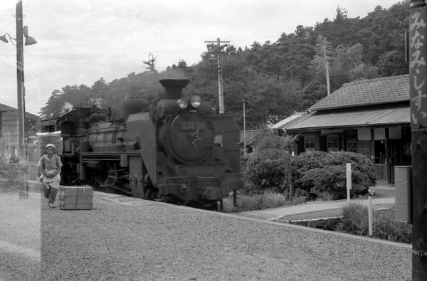 ザ〜〜ンネン。時は夏、冷房のないDC急行の窓は当然開けっ放し。でも汽車キチ (いつから鉄って言うようになったんダロ?)のオラッチに車窓は格好のファインダー。 祖父の墓参りとは口実で、お供で行けばロハでジョーキの写真が撮れるって言う訳。 お待ちかねのジョーキは、佐倉の手前、南酒々井でやっと交換しました。今は無人の 南酒々井ですが当時は駅員さんもおり、ここは名撮影地だったらしい。筆字体の 駅名標と、有名な千葉のかつぎ屋のおばちゃん(行商人のことです)の姿が懐かしい。 日頃は川越線や八高線ばかりだった中坊が、初めて遠征して撮った蒸気機関車の