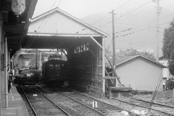 スイスの山岳鉄道にも負けないスケールで、80パーミルの急勾配や30Rの急曲線を 粘着運転で登坂する箱根登山鉄道の終点強羅でございます。なんでコンナ小汚い 写真をアップしたか、その訳は線路の終端部分が一見車庫のような建物に覆われて いますよね。そして、その建物の中に怪しげな車両が一両留置あるのが見えますか? よぉ〜く見ると屋根に車体と不釣合いなでっかいパンタ、車体正面にはへそライトが あるでしょ。この怪しげな車両はユ1形という形式名の電動貨車なんでございますよ。 この「ユ」ってぇのは郵便の「ユ」じゃなくって、有蓋車の「ユ」だそうなんです。ユ1形 電動貨車は当然今ではお目にかかることは不可能、1975年には肩叩きされて暫らく 入生田で留置となった後に強羅で静態保存されたそうなんでけど、野外だった為に 木造車の悲しさか、結局風葬となってしまいました。しかし、ユ1形に付いてネット上で 調べるとポール集電らしいんですけど、この写真じゃどう見てもパンタ集電ですよね、 イッタイどっちが本当なんだろ? 箱根登山鉄道