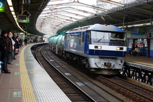 ホームには列車を待っている沢山の乗客、スレートの上屋を支えているのは建築用 鋼材、如何にも4ドア20mの通勤用電車ナンカが引っ切り無しに行き来する、都心の 高架駅ですね。そんな駅に現れた貨物列車、タキを連ねたEF210が轟音を響かせて 悠々と通過して行きます。貨物列車が大量輸送の主役だった頃は何処でも見られた 光景でしたが、物流インフラが高速道路と大型トラックにシフトしている今となっては 結構レアな光景になりましたね。しかし、日石の製油所を抱える根岸線では現在でも かなり高密度で貨物列車が銀箱電車E233の間を縫って走っているんでございます。 駅を降りればファッショナブルな伊勢崎町と中華街が広がるミナト横浜の都心の駅 「関内」で写せた、周りとはちょっぴりミスマッチな光景の駅撮りのご紹介でした。 根岸線 関内 2009-2 Photo by 団長 |