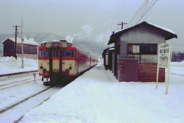 ここ暫らくデジカメの駅撮りが続いたので、今週は雪景色の銀塩昔写真で暑気払い、 暑中お見舞い申し上げます。出発して行くのはキハ56の上り急行宗谷、そのホームに 立っている駅名票に「音威子府」と書いてあるのが判りますか?むかし蒸気機関車を 追いかけて冬の北海道を赤貧の旅で巡った、思鉄の面々この駅には特別な郷愁を 感じるのでございます。興浜北線の9600貨物レを撮る為、鼻毛も凍る真冬の真夜中 3時過ぎ、急行利尻から天北線の始発に何度乗り換えた事か、無けなしお金を叩き 買った常盤軒の二段幕の内弁当。常盤軒といえば駅蕎麦が有名だけど、思鉄面々は こちらの方が思い出深いのでございます。なんと言っても一日三食食パンの生活から 開放される訳ですから。 宗谷本線 音威子府 1975-2 Photo by 団長 |