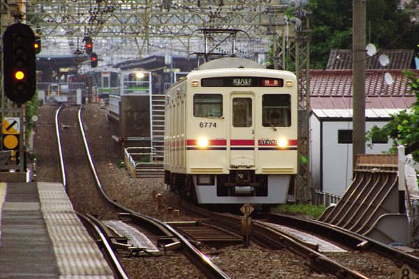 短い駅間距離の向こうに見えるのは都営地下鉄新宿線に直通する新線が分岐する、 高架の笹塚駅ですね。その笹塚から高架を下り玉川上水を超えたところにあるのが 今回ご紹介の京王線代田橋駅でございます。単に進入して来る列車の編成全体を 入れて撮るには、決して好条件の駅じゃないってぇのは、写っている6000系を見ても わかりますよね。でも、ラーメン架線柱に閉塞信号、6000系のバックには笹塚駅の 場内信号や都営の車両も写りこんでおります。如何にも都市圏の交通を担う私鉄の 情景じゃございませんか?ろくでもない写真を何十年も撮っていると、ナンデあの時、 アレも入れて撮らなかった!などと言う悔しい思いが多々ございます。そういえば、 6000系特急八王子行き、なんてぇのも過去形になってしまいましたね。10年後には 信号機は車上信号に、ラーメン架線柱はパイプの架線柱に代わってんだろうなぁ。 京王線 代田橋 2009-6 Photo by 団長 |