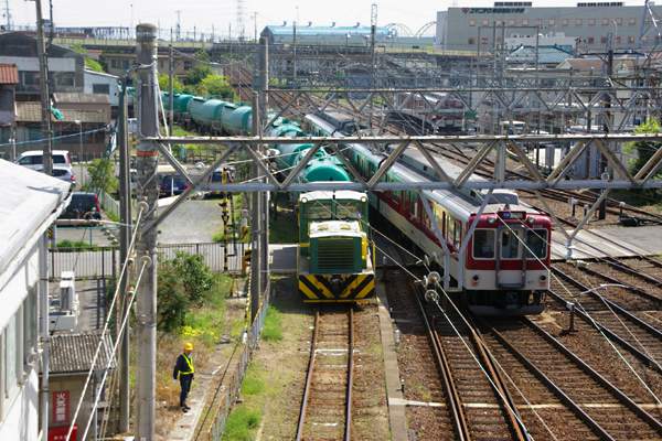 先週(2012年4月28日)の土曜日、悔しいけれどJRト〜カイに大枚叩きDD51重連を 日帰りで関西本線貨物線に撮りに行った時に写した、駅撮りをご紹介でございます。 今となっては、70年代SLブームの主役だったD51よりも、お宝と化したDが一つ多い DD51ディーゼル機関車が重連運用で走る訳ですから、昔を思い出すと複雑な気持ち ながら、鉄な魅力十分なのです。しかし、重量感溢れるDD51重連よりもモット思鉄を 狂わせるのが、JR貨物の列車が運んできた貨車を到着駅で受け、自社工場に運ぶ 専用線とスイッチャー(入換機・Shunter)なのでござます。当然貨物専用線ですから、 時刻表なんぞは、端からありゃしない訳なんで、JR貨物発着時間からスイッチャーの 時間を予想したり、ググったりで登場をお待ちするんですね。そんなことで、塩浜駅の 跨線橋で待っていると、タキを従えた昭石四日市の入換機が駅に入って来ると同時に 直ぐ横の線路を近鉄名古屋線2000系ローカル列車が発車、思わず並びのシーンを 記録に残せ、チョッピリ幸せな気分になったのでございました。 関西本線貨物支線・近鉄名古屋線 塩浜 2012-4 Photo by 団長 |