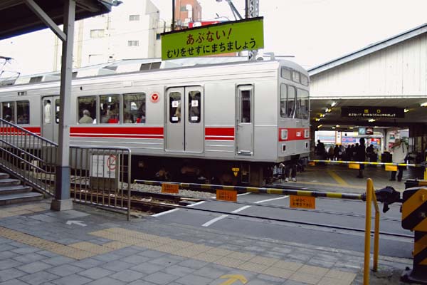 今回は駅撮りじゃなきゃ絶対に撮れない写真おば一つご覧頂きます。駅撮りファンの ミナサン、構内踏切って知ってます?ホームとホームの行き来に駅構内に設置された 踏切を利用する、実にバリアフリーな駅施設なのです。とは言うものの、駅を発着する 列車と乗客が平面で接する為、列車が到着しても遮断機に遮られ乗れない、降りても 直ぐに駅構外に出られない、なので降りた遮断棹を潜る輩の出現等、マイナス要素が ございます。当然跨線橋や地下通路と較べ、事故発生リスクも上がる為、列車密度の 高い都市部では。著しく其の数を減らしております。路線の大部分が人口密集地域の 東急で唯一残っていのが、池上駅の構内踏切でございます。これで、ワンマン対応の 柵が無くって、電車が銀箱じゃ無かったら100点満点付けられる、オジサン鉄大好きな 昭和チックの光景なんですけどねぇ。 東急池上線 池上 2004-12 Photo by 団長 |