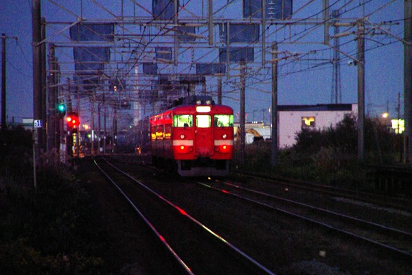 「秋の日は釣べ落とし」とは、よく言ったもんでございますね、夕焼空けにカシオペアと 淡い希望で錦岡駅に来てみたものの、お天道様は山の端に隠れ、漆黒が辺りを包み 初めておりました。こうなると、アッシのおんぼろデジカメじゃ普通に写真を撮る事は、 如何ともし難く、一か八か広角流しを敢行するも、想像を絶する通過速度と腕の悪さ、 結果は当然の如く惨敗でございました。肩を落として帰ろうとした時、苫小牧方面に ヘッドライトがピカ〜リ、列車が近づいてたのでございました。ダイアを確認してみても この時刻に到着・通過列車共に無く、首を傾げていたところ、謎の列車は錦岡中線に 入った所で停車いたしました。夜景に浮かび上がったのは、国鉄時代の面影を残した 糸井折り返し711系交流電車でございました。でも、なんで糸井折り返し普通列車が 錦岡の中線にっと思い、後からグーグルマップで確認したら、糸井に折り返し設備が 無いのが分かり、錦岡中線発着に納得したのでございました。しかし、折り返しの為、 錦岡中線まで来るんなら、室蘭方面の配線変えて錦岡まで客扱いすりゃ良いのにね。 室蘭本線 錦岡 2011-10 Photo by 団長 |