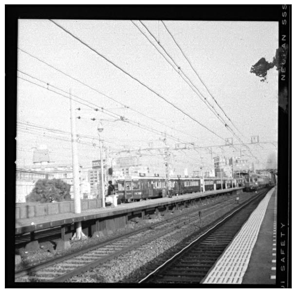 銀塩からデジに変わった今も、変わらないのがニコンとキャノンの二大ブランドですね。 でも、当時の貧乏鉄にゃドッチのF1も高嶺の花、ニコマートやFTb辺りが精々でしたね。 そんな時代にひょんな事からハッセルブラッドを使う機会に巡り会い、撮ったのが今回 アップした情け無い阪急は中津駅での駅撮り写真でございます。当時ハッセルと言えば ニコンもキャノンの地面に平伏すほどのブランド力があり、一度は写してみたい憧れの カメラでございました。そのハッセルで撮ったワンカット、極細ホーム外側の京都線を 梅田に向かうは当時最新鋭の6300系特急、宝塚線ホームに進入して来るのは現在も 現役5100系5136Fなのです。で、この写真黒い縁がナゼ付いたまま?思いますよね。 35mmは安物のフイルムスキャナーでスキャンできるんですけど、ブローニーとなると ウン十万もする高級品じゃないとスキャン出来ないのでございます。なので、無理やり 複合機のスキャナーで反射原稿として読み込み反転したんで、これで精一杯、セッカク 一生一度のハッセルなのに、トイカメラより情け無い写真で失礼おば致しました。 阪急宝塚・神戸線 中津 1977-10 Photo by 団長 |