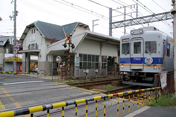 踏み切りの遮断桿越しに写っているのは、如何にもシャッター押すのが早すぎってな 感じの南海7100系のクハ7959を先頭にした、和歌山港行き普通特急でございます。 でも、このタイミングでシャッター押したのは、駅舎と列車を絡めたカットを撮りたいが 為のことなんです。ってな訳で、今回の駅撮り探検団、車両じゃなくって駅舎が主役 なのでございます。今から100年以上昔明治の御世に開業した南海、始発駅難波こそ 荘厳なドームからコンクリートとガラスの詰らない駅になっちまいましたが、和泉灘を 南下すれば瀟洒な造りの駅舎が、点在しております。その中で浜寺公園駅駅舎ほど 有名じゃないけど、駅名の由来をデザインしたステンドグラスが、チャームポイントの 蛸地蔵駅駅舎なのです。それから、駅舎と共に宜しいのが「蛸地蔵」と言う駅名じゃ ないでしょうか?近頃は、古来からの地名・伝承・地形を無視した○○ヶ丘や××台 駅傍の集客施設がそのまま駅名など、情け無い限り、お願いだから南岸和田なんて 駅名にしないでね。 南海本線 蛸地蔵 2008-9 Photo by 団長 |