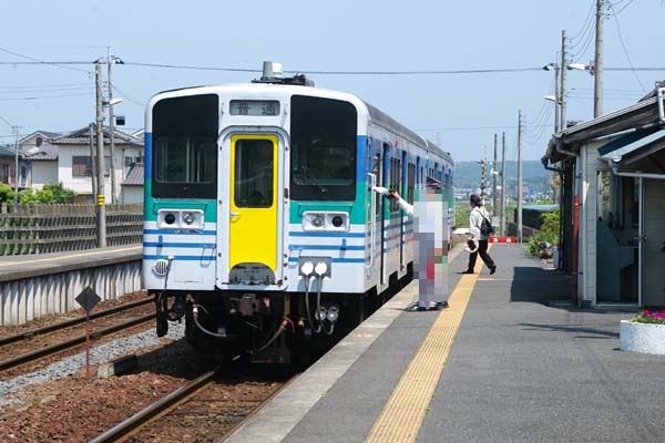 続いて2ドアのキハ37+3ドアのキハ38で編成された下りが、向かい側ホームへ到着。
