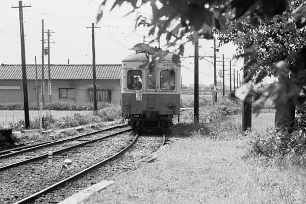 汽車の窓から石を投げりゃ電車に当るとナンテぐらい、石川県下に戦時統合で寄せ 集めた路線網を形成していた北鉄、その路線の一つに小松線と言う6km弱の短い 路線がございました。始発駅小松は5年ほど前にアップしたので、今回ご覧頂くのは、 唯一の交換駅だった加賀八幡駅での駅撮りでございます。もっともコノ写真を撮った 日中の交換は行なわれなかったと記憶しております。それでも、単行の列車が駅に 着くとタブレットキャリヤーを肩に掛けた駅員さんが、ホームに立ち通票の受け渡しを しておりました。未舗装草ボウボウの土盛りホームには、真夏の日を遮る桜木数本、 傾いだ木製架線柱に直接吊架の架線、車長15m弱の小型車3000形が、良く似合う ローカル私鉄定番風景の北鉄小松線加賀八幡駅撮の一幕でございました。 北陸鉄道小松線 加賀八幡 1976-8 Photo by 団長 |