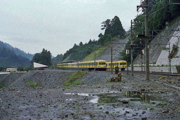 当時私鉄最長の隋道正丸トンネルを開通させ、1969年10月に吾野〜西武秩父間を 開業したのが、西武初の本格的山岳路線西武秩父線でございます。毎度役立たずの 駅撮り探検団、今回はその西武秩父線開業から2年後の正丸駅でのスナップ写真を 御覧いただきます。路盤盛り土法面はほぼ土がむき出し状態で、開通してから然程 年月が経っていないのが、分って頂けるんじゃないでしょうか。駅では西武秩父線の 開業に合わせて思い切って新造した、抑速付きピカピカの101系が仲良く並んで交換 停車中ですね。先発は左の恐らく池袋行き急行、三角形をモチーフにしたが特徴の 駅本屋横の出発が青現示、下り2番出発信号に併設されている中継信号の現示も 縦一列に点灯して、上り出発の青現示を示しております。後発の下り列車正面には 真丸のヘッドマークが、付いているの分りますか?この101系は、当時運行していた 休日急行奥武蔵号西武秩父行きでございます。それから駅前に停まっているのは、 西武バスですが、現在は正丸駅に発着する路線バスは廃止のようです。そんな事で 今回は、撮った列車が、西武旧101系休日急行奥武蔵だったお陰で、ヘッドマークに 湘南フェースとワンカットで三回楽しんで下さいねぇ。 (許可を頂いての撮影ですが、当時はOKでも現在は先ず無理です。) 西武秩父線 正丸 1971-10 Photo by 団長 |