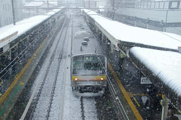 一月も終わろうとする月末、首都圏は約1年ぶりの本格的降雪で白く染まりましたね。 そうなると、当然各交通機関のダイヤは乱れっぱなしになり、働くオトーサンに学ぶ オネーサンなど、普通の感覚を持っている方々は憂鬱な朝となったのでございます。 ところが、爪の先から頭の先まで鉄分が溢れている人達にとっちゃ、雪やコンコン♪ 霰やコンコン♪鉄は喜び駅駆け回るなのでございます。ってな訳で、当然駆け回って 撮った駅撮りを御笑覧頂きます。2014年秋に運用開始した南武線E233 8000番台、 瞬く間に増殖して205系の運命を脅かしており、3本に1本はE233がやって来るってな 感じなんですよ。そこに雪とくりゃ、南武線205系最後の雪景色なんて発想が思わず 出てくるんだけど、駅間の走行写真を震えながら撮る根性など、勿論ございません。 なので、喜び駅駆け回って稲田堤駅跨線橋から撮ったが、まもなくお別れ南武線の 205系は、雪の到着シーンの一コマでございます。 南武線 稲田堤 2015-1 Photo by 団長 |