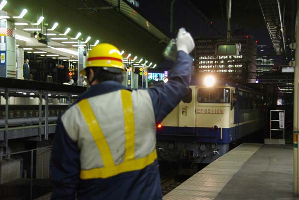 いると、牽引機が入線して来ました。今夜のカマは田端運転所って言うより、ヤッパ 田端機関区のEF65 1109って言った方が、オジサン鉄は心地よいのでございます。