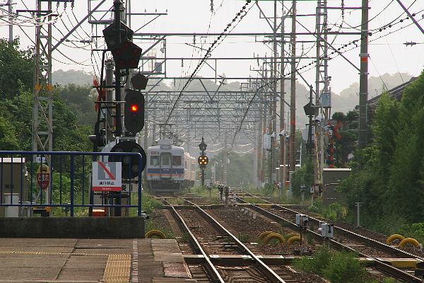 薄曇の逆光に黒く霞む和泉山脈に向かって、和歌山港行きの7100系特急サザンが 通過して行くは、南海本線淡輪駅でございます。写真の方は相変わらずのホームに 柵、その他種々雑多な柱が写り込んだ適当駅撮り写真でございますが、駅撮りなら 駅施設等が写り込んで当たり前と、居直っちゃうのです。自分的には、白色灯が5つ 点灯した踏切動作反応灯にゴージャスなコンパウンドカテナリーなどと、昭和生れの 7000系列鋼体抵抗制御電車と組み合わせが、何故か嬉しいのでございます。でも、