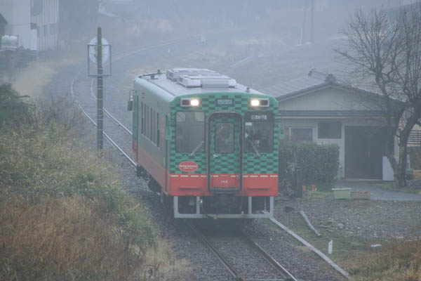 ほどなく下館方面よりモオカ-14型気動車が、霧の中から現れてきました。このDCは レールバス然としたモオカ63型と比べると当に気動車、鉄道車両でございますね。