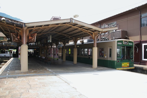 1日券を買ったんで、先ずは終点嵐山まで行っちゃいました。駅舎の方は詰まんない 造りでガッカリだったけど、ホームの上屋や梁は中々の趣でございました。ホームに 停まってんのは、アッシが乗って来たモボ622箱はモダンになっちゃてるけど、実際は 戦前製モボ121形の更新車なんで、バリバリの吊り掛け車なのです。京紫が標準色と なっちまった嵐電ですが、ヤッパ単色よっか緑とクリームのツートンの方が良いやね。 京福嵐山本線 嵐山