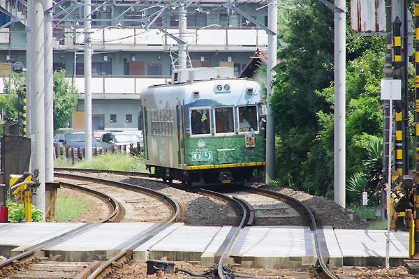 1番線嵐山方面ホーム端からは、上りのモボ100形を素直なアングルでお気軽撮影。 京福嵐山本線 帷子ノ辻
