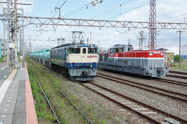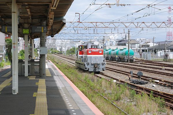 以前にも駅撮り探検団で何回かアップした、鶴見線の安善から南武支線・武蔵野線・ 南武線を経由して青梅線の拝島まで走る、タキを連ねた8000番台の貨物列車、所謂 米タンってヤツでございます。今までアップした米タンは、拝島入換・青梅線・南武線 だけなんで、今回は始発の安善でのスナップをアップしちゃいます。安善に到着して さぁ〜ってどうすんべぇ、なんて考えてたら直ぐに浜川崎からDE11が、単機で貨物下り 本線に到着いたしました。一旦停止後直ぐに構内を転線、浜安善駅廃止後は安善の 構内扱いになっちゃってる、旧浜安善支線に一番外側の線から出てっちゃいました。