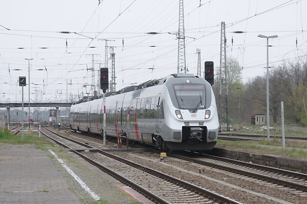 規模の大きい駅の割りにゃ旅客列車の方は、各運転系統とも2時間ヘッド貨物レに 比べりゃチョット情け無いのです。その旅客列車が、駅撮り始めて1時間経った頃に やっとこ1本入線してきました。車体はシルバーですが、DB1442-3型5連接車電車の 運用で運転されてる、当駅止まりのRB(普通)列車でございます。この1442-3だって ボンバルディアのタレント2ってブランドのレディーメイド車両、ホントやんなっちゃう。