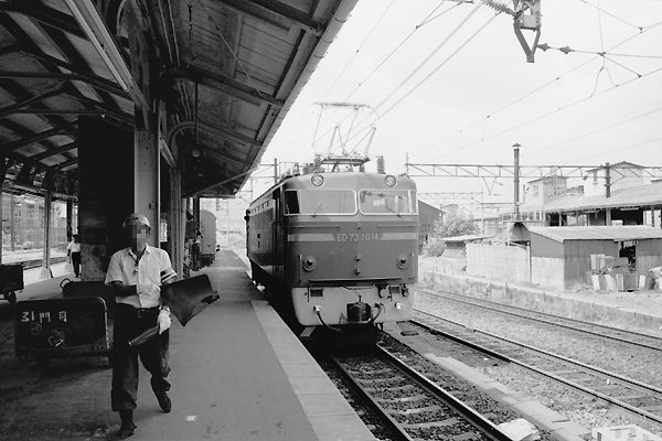 カマが離れヘッドマークと供に顔を見せた「あさかぜ2号」は、寝台幅52cmの20系が 殆んどだった寝台特急の中、僅か3本だけ70cm幅の14系で運行されていた列車の 一つでございました。夜行列車って言やぁ旧客のボックスシートが、ビンボ〜学生にゃ 当たり前だった時代、、20系がシングルルームなら14系はスイートルームでしたねぇ。