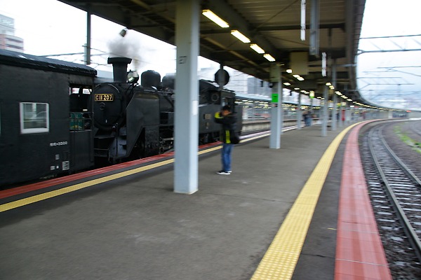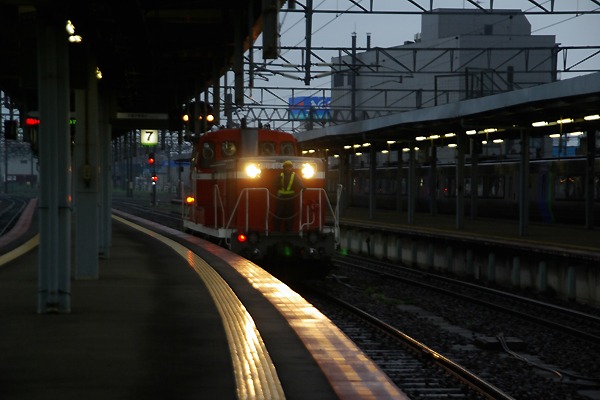 5年前(2014年)のGWにもう直ぐ無くなっちゃう、寝台列車の記録をメインに北海道を 鉄旅した最終日、最後はC11「SL函館大沼号」の入線を撮っちゃおうっと、函館駅で 到着待っておりました。ところが、突然空は暗雲に覆われて露出は、あっという間に ガタ落ちとなり、狙いの入線シーンはオジャンなっちまいました。編成から後部補機の DLが、離れて10分ほど経った頃、残ってた編成をクラまで持ってくDE10が、入線して 来ました。入換え連結作業の速度だったから、5.60 1/50で切ったけど、ご覧のとおり 露出不足画像となっちまいました。こうなるてぇっと、アッシのボロカメラじゃお手上げ、
