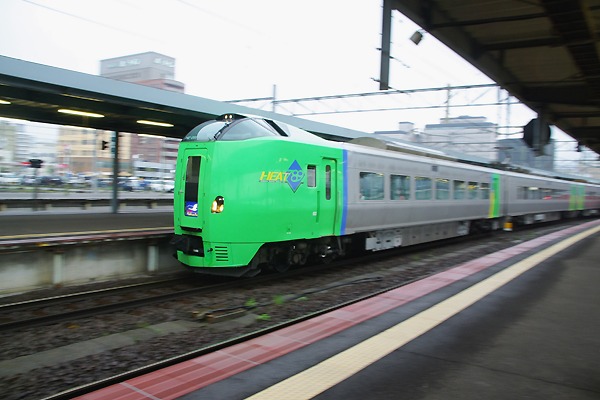 残る手段は一か八かの流し撮りなのです。マニュアルでIS400 7.10 1/20 にセットして 後はエイヤァで、789系「スーパー白鳥」出発を撮ったら、露出はほぼ適正なりました。