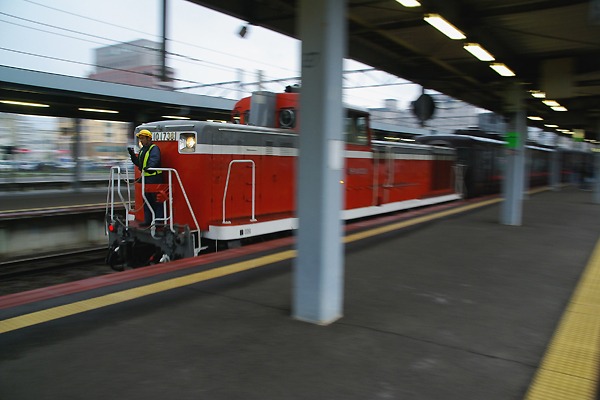 今度ぁ1/20じゃ腕の方が伴わないんで、1/25のシャッター優先にしてDE10の入換え 牽き出しでございます。思惑通り先頭部は止まったけど、屋根が多い分露出が不足。 まぁ、それ以前にホーム幅が無くって引き取れず、支柱が撮れて串刺し一丁上がり。